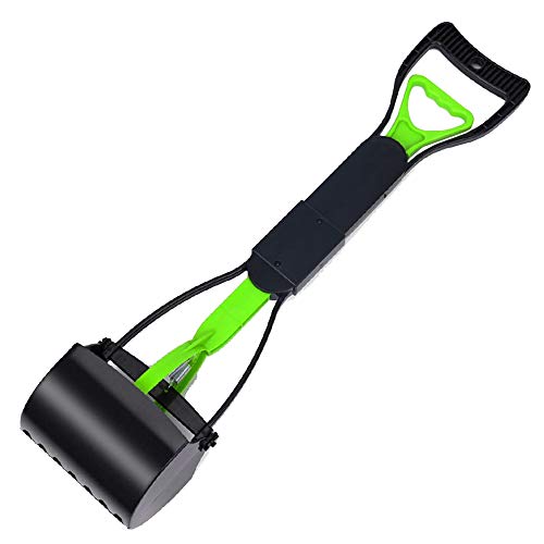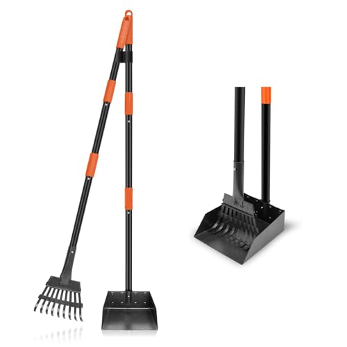 Dog Pooper Scooper with Adjustable Handle:The lightweight handle extends up to 36 inches,No more breaking your back to bend down and scoop up dog poop with your hand and dog poop bag. Rake and then lift the pan to contain waste.