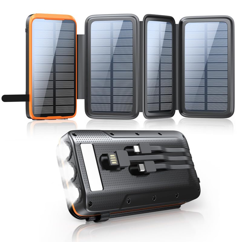VOGHERB Solar Power Bank, Solar Charger with Solar Panels, Torch, Power Bank with Cable, 4 Outputs and 2 Inputs, 22.5 W PD3.0 Fast Charging, Waterproof External Battery Solar Charger for Smartphones