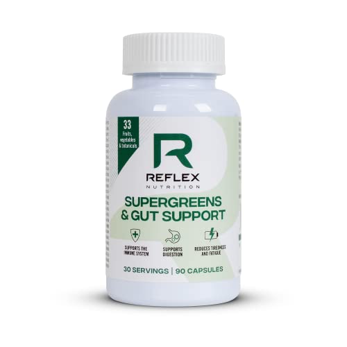 Reflex Nutition Supergreens & Gut Support – 33 Active Ingredients – Prebiotics, Probiotics, Vitamins & Minerals – Immune Support, Reduce Fatigue & Bloating – Vegan Gut Health Supplement (90 Capsules)